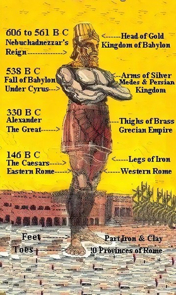 The best place to start is 2,600 years ago, in the Book of Daniel. In Chapter 2, then-king of Babylon Nebuchadnezzar dreamed of a statue, and God gave Daniel the ability to interpret its meaning. This image: